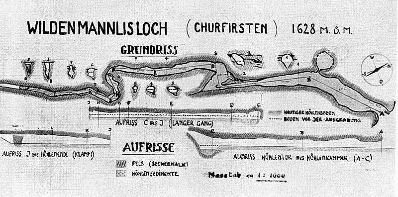 Picture credit: Wildenmannlisloch, der Höhlenplan der Ausgrabung von 1927. Sketch by Emil Bächler. (Bild: Verlag SAC Sektion Toggenburg) via Tagblatt