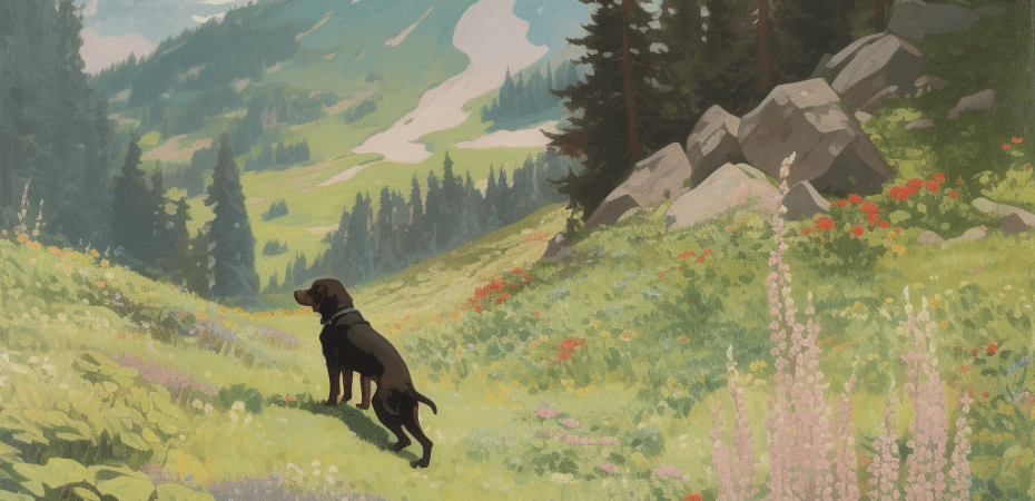 Once a dairymaid came to the alpine dairyman and asked him for a little milk. Then she asked him to accompany her. She led the man to the place where the treasure lay. He had to lift it by hitting the little dog that was sitting on the chest three times. He hit it once, and the little dog grew huge. The man was frightened and backed away. Then he heard a loud bang, followed by the weeping of the maiden, and everything disappeared.