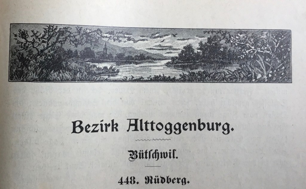 At the mouth of the Tobelackerbach stream, Castle Rüdberg (Hunting Dog Mountain) stood upon a crag above the River Thur. Sparse remains indicate its location. Even 100 years ago, suicides were buried in its vicinity, which is why the place does not enjoy the best reputation in popular belief. Yet it holds great treasures. Three strong and courageous men who once spent a night in the old walls digging for gold declared that they would not repeat the dare at any price.
