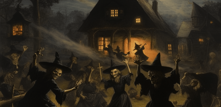 One night, a hunter heard his name called three times and stepped in front of his hut. There he heard the same call, but from far away. He followed the call and came to the level ground of the witch’s hut. Bright lights shone out into the night; with beautiful music, wild figures swayed in wild dance on the lawn, and at a long, richly-appointed table he sees a number of black-clad figures with pale faces seated, repeatedly inviting him to dinner. “Before eating,” he thinks, “one must pray,” and he does. Then he wants to sit down at the table and says to the next person, “God bless it!” Then the pale faces stare at him, and everything was gone. Through the dark night the hunter returned to his hut.