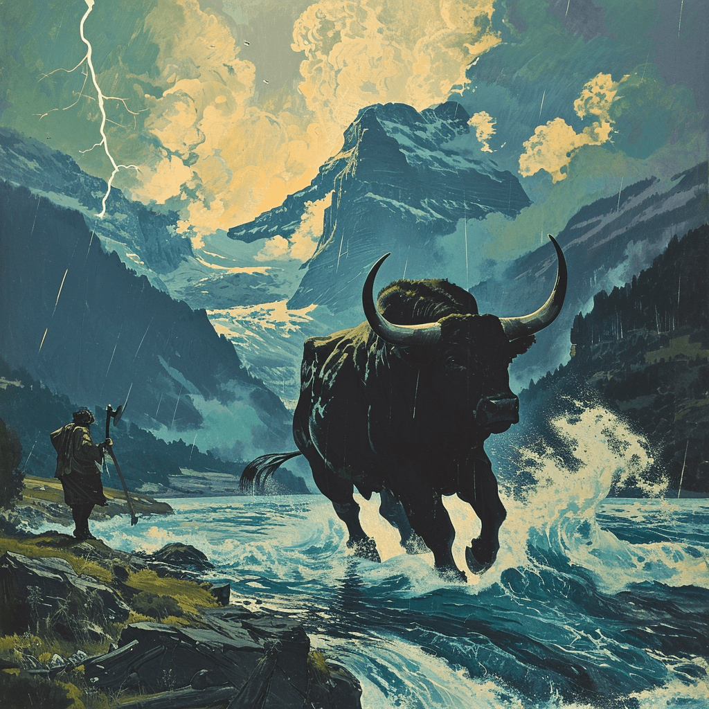 The farmhand agreed to do anything possible for him, and immediately they set off together. The lake lies in a wild high valley. When the two dairymen reached it, they heard a roar from the depths of the valley, as if a thunderstorm was coming. The black waves of the lake grew from minute to minute, then spewed their whitish spray high up on the cliffs of the shore and finally also threw a huge bull onto the land, which rushed over the steep slope towards the herdsmen, bellowing and roaring loudly.