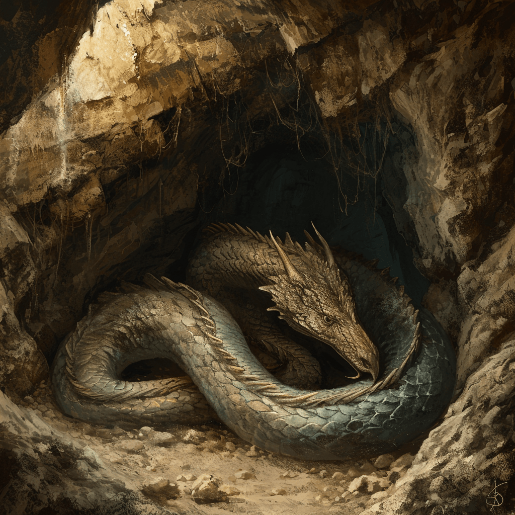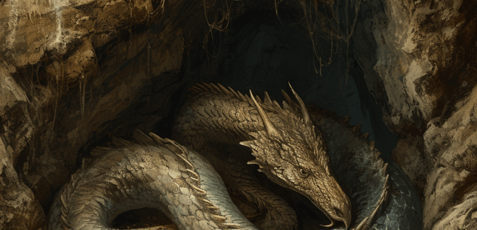 What he liked least was the fact that there was a living Lindworm in the cave and he thought he would immediately be eaten as a delicacy. But the monster was not as cruel as the herdsman thought; it looked at him trustingly, wagged its long tail and seemed pleased to have received a companion.