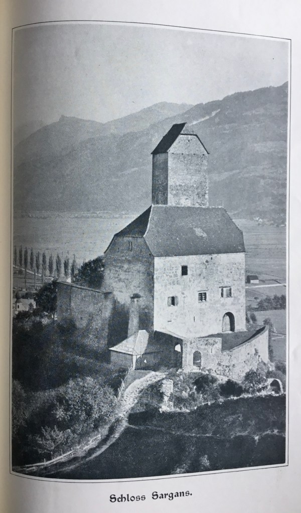 In Sargans, there must naturally be ghosts haunting the castle, whether one wants it or not; in old castles, ghosts always have the right of way because in the past, arrogance, overconfidence, money, and injustice were the rule. People still fear them today, and I would bet that no one would dare to sleep alone in the “Armsündersaal” (Hall of the Poor Sinners) for a night, even if they had the most splendid bed. At midnight, chains rattle, or the governor taps up the long, dull-sounding stairs with his staff and old wig; or an old bailiff comes in through the Ringmurtürli (a small door) and looks for the Urner, Swiss, or Glarner flags on the wall, and in anger at seeing everything so neglected, he messes up the bed.