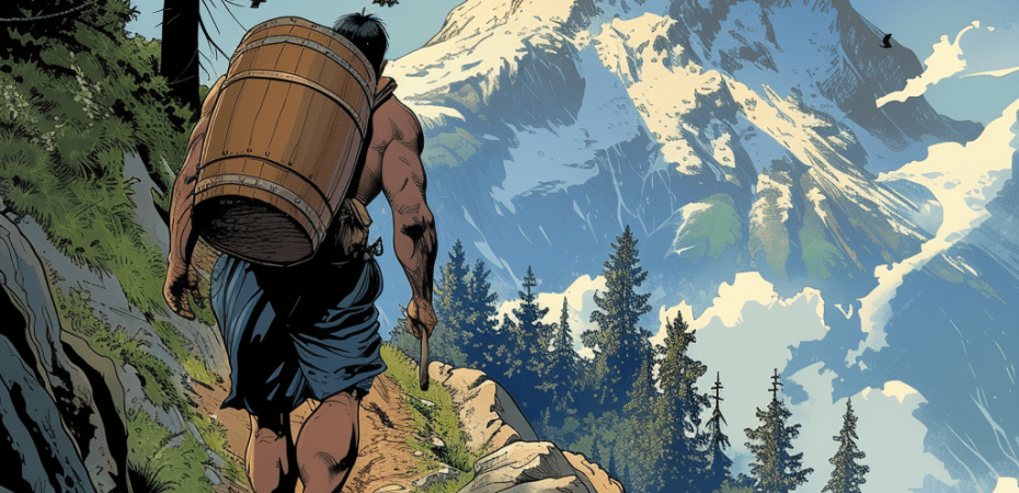 Der Stärkste dieser Starken war der Benedikt. Einst trug er ein gewöhnliches Fass Salz vom Tale aus, ohne auszuruhen, auf dem Rücken nach Palfries (3 Stunden). Noch grösser war aber seine Leistung beim Bau des grossen Hauses. Da trug er das dicke, 50 Fuss lange “Hauptträml” der Stuben- und Küchendiele allein auf dem Rücken aus dem Walde zur Baustelle – eine Last, an der jetzt vier baumstarke Männer verzweifeln würden.