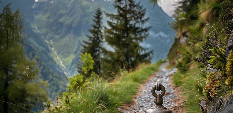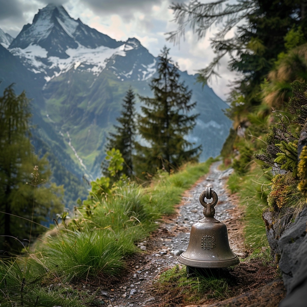 a Swiss church bell lying on an alpine path – Midjourney 6.0